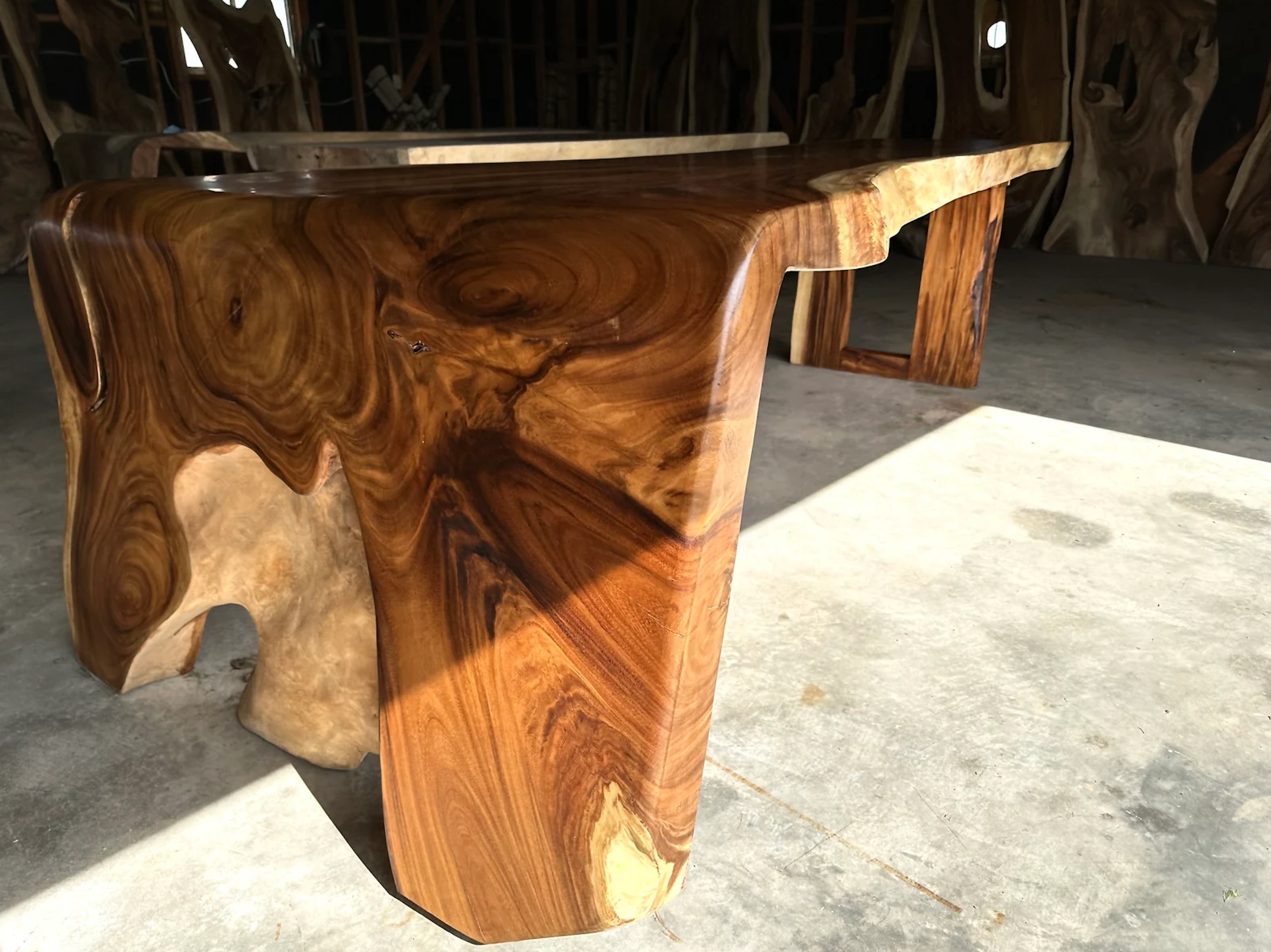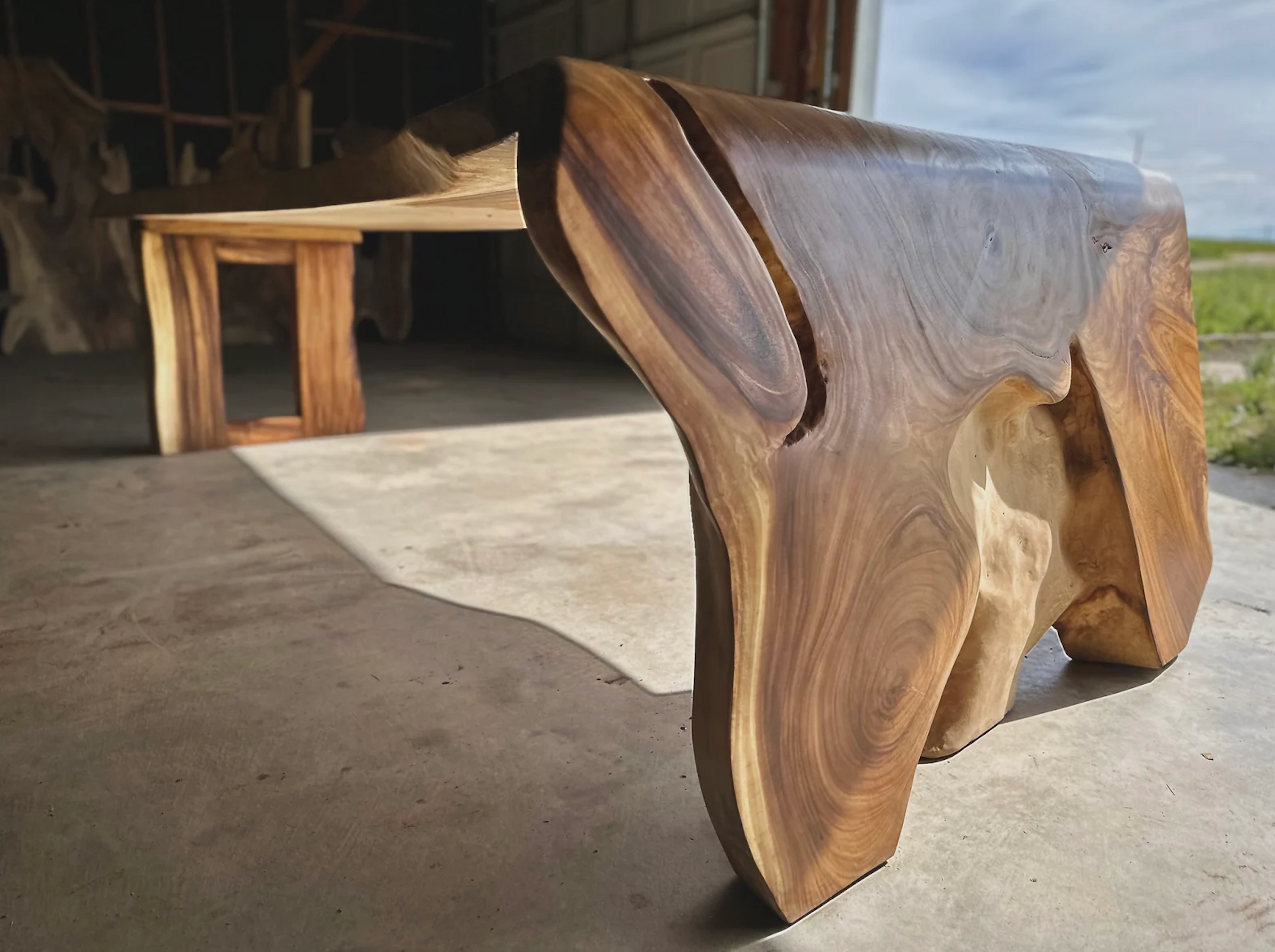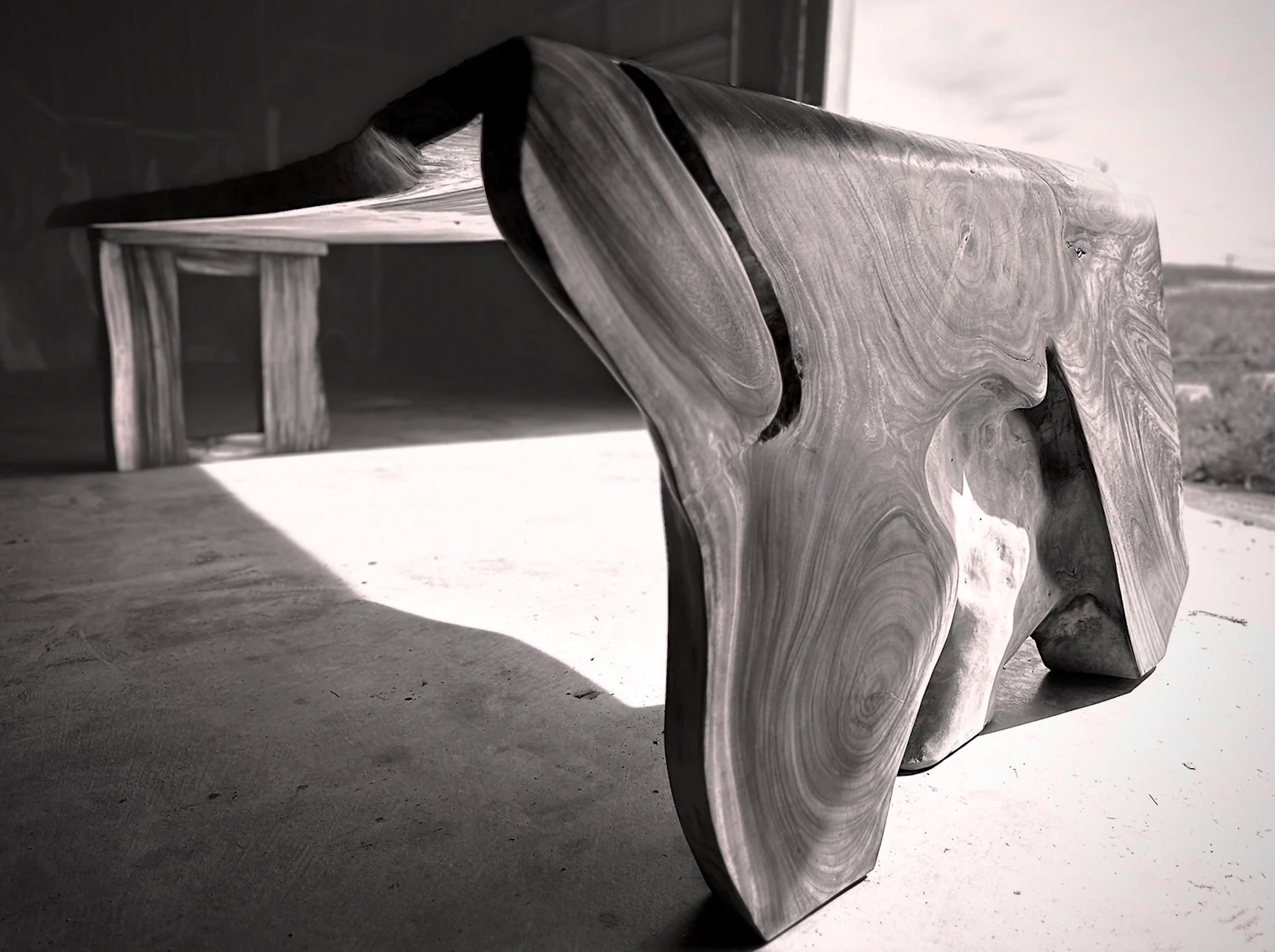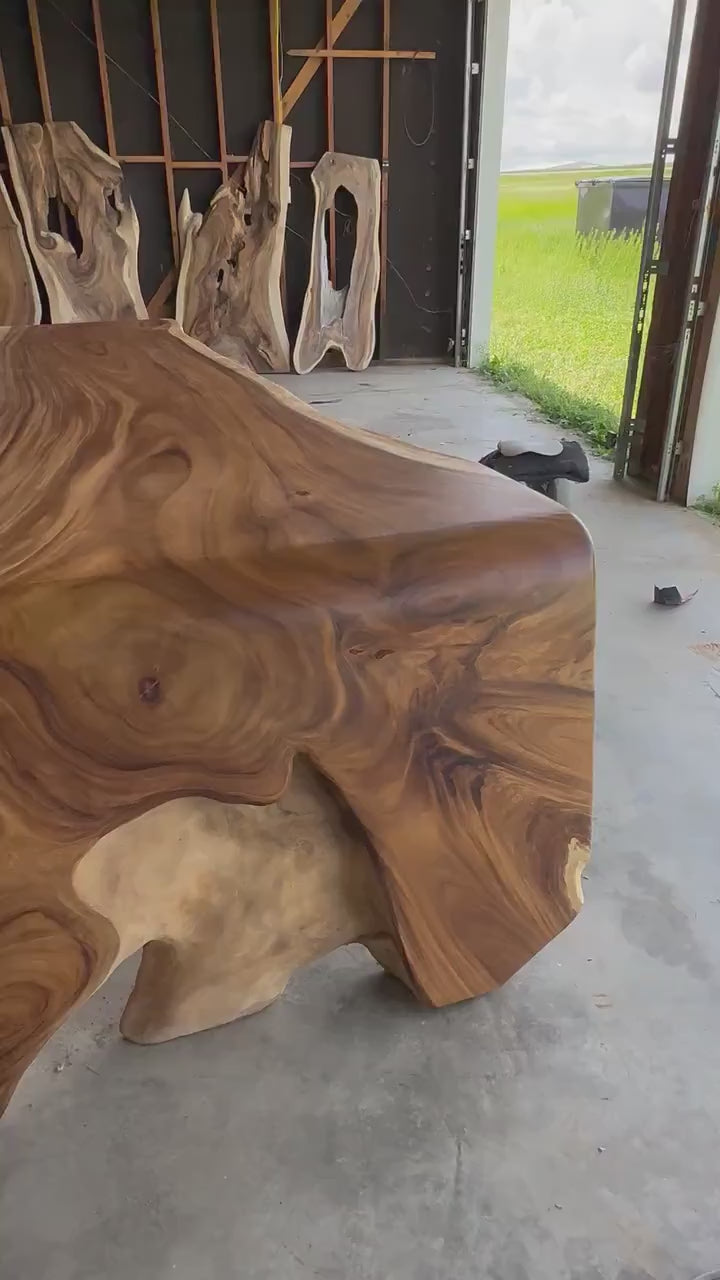 This rare, one-of-a-kind L-shape table is a pre-order item and will be custom-made just for you. Carved with precision using a chainsaw from a colossal tree trunk with a 6-foot diameter, this table is a true masterpiece. The L-shape design, measuring 11 feet long, 4 inches thick, 54 inches wide at the front, and 32 inches wide at the back, brings a unique and powerful presence to any space.